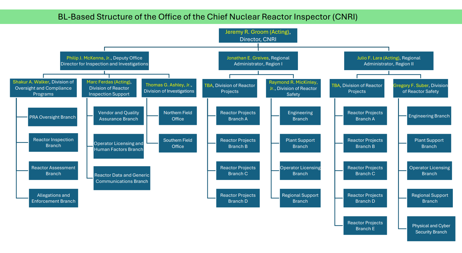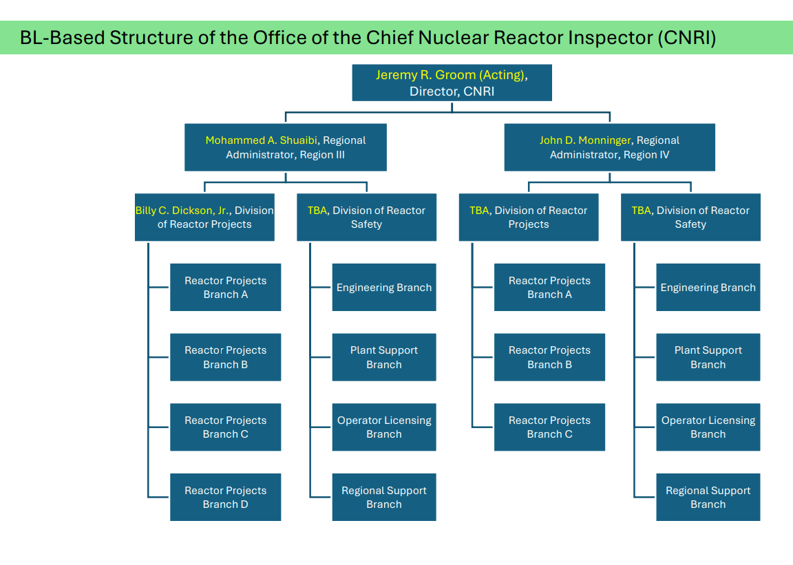 The Office of the Chief Nuclear Reactor Inspector (CNRI) will be formed to lead implementation of operating reactor business line oversight functions. The portions of all four regional offices that perform operating reactor safety and security inspections and operator licensing will report to the CNRI Director. Vendor inspection and inspection support functions such as reactor inspection program management, operating experience, enforcement, and allegations will be part of CNRI.