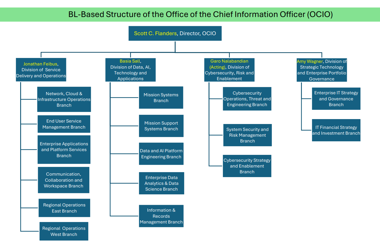 The Office of the Chief Information Officer (OCIO) will assume additional technology and information management responsibilities currently dispersed across the agency. OCIO plans, directs, and oversees the resources to ensure the delivery of information technology (IT) and information management (IM) services that are critical to support the mission, goals, and priorities of the agency. The OCIO also oversees Freedom of Information Act (FOIA) and Paperwork Reduction Act compliance.