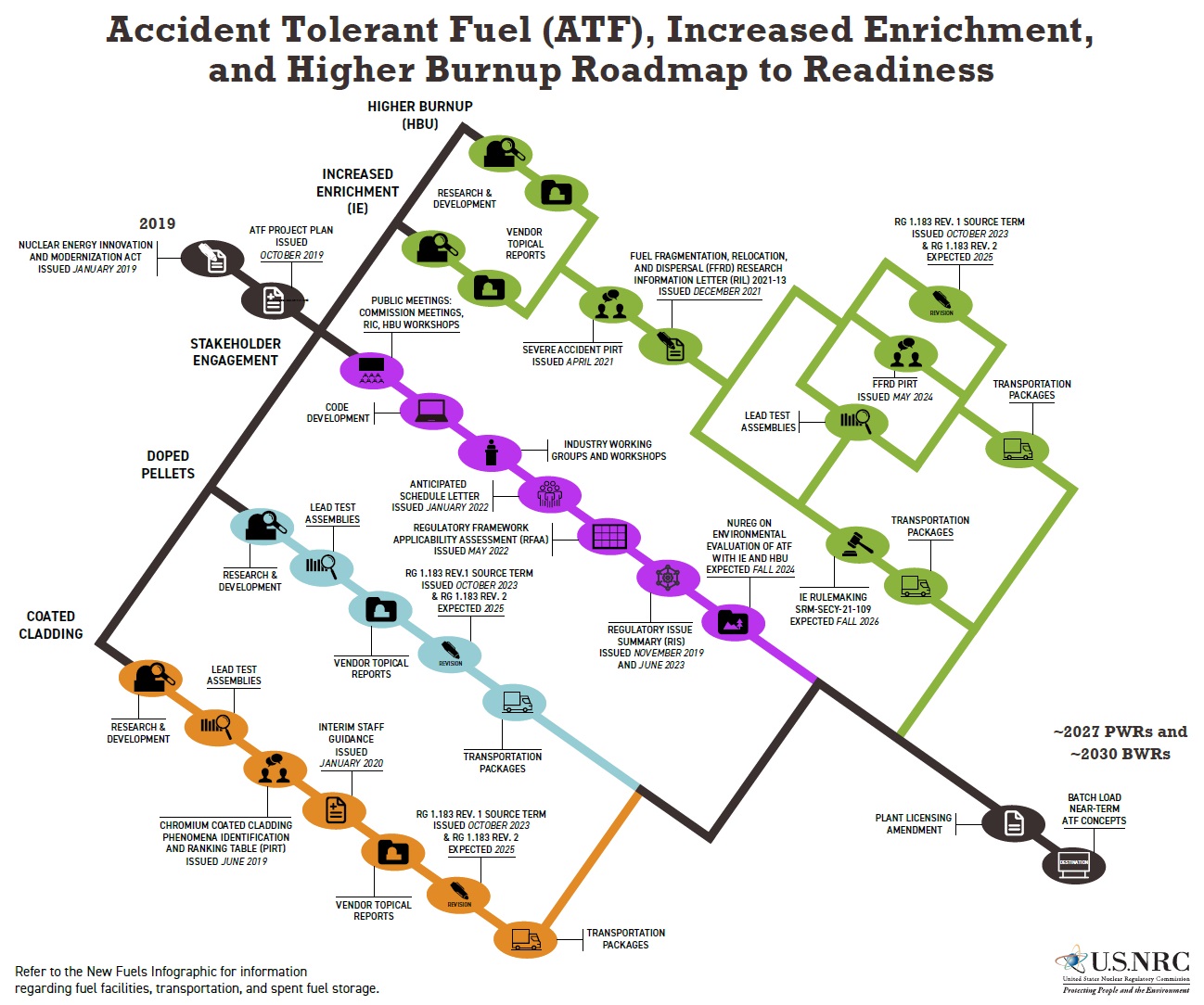 In June 2023, version 1.0 of the “Roadmap to Readiness” was finalized and issued. Versions 1.1 and 1.2 were issued in January and July 2024 respectively, incorporating internal and external stakeholder feedback. The graphic complements the ATF Project Plan, encompassing the priorities identified in Regulatory Framework Applicability Assessment and Licensing Pathway Diagrams for the Licensing of ATF-Concept, higher Burnup, and Increased Enrichment Fuels. By providing: