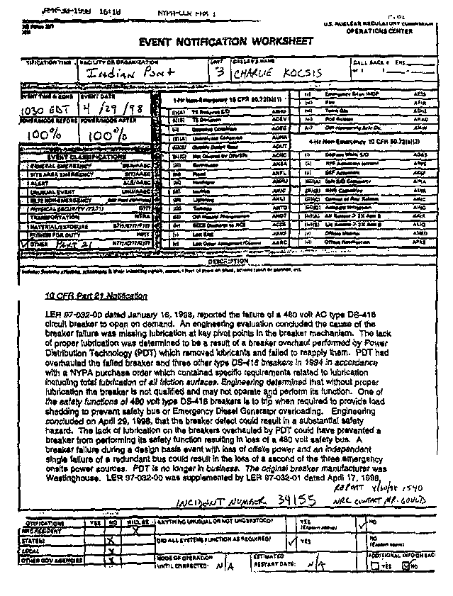 | FACILITY: INDIAN POINT | REGION: 1 | NOTIFICATION DATE: | 04/30/98 |