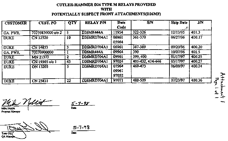 Based on our discussions with Cutler-Hammer, Asheville, NC, it was learned that one four pole attachment was returned to them in October 1997 that had the same incorrect configuration as described above. Even though this was the only return they had received, they immediately implemented corrective actions to prevent recurrence. The corrective actions included retraining of Cutler-Hammer assembly personnel, updating procedures, and performing checks of future lots to verify this condition did not recur. No additional problems were found as a result of these checks. Additionally EGS confirmed that the unacceptable four pole attachments were manufactured in Asheville, NC. Asheville began assembling the subject four pole attachments in early 1995. Based on this information it is concluded that front attachments with five digit date codes identifying a date of manufacture between January 1995 thru October 1997 are suspect. A review of all shipments of relays supplied with D26MF four pole attachments was performed and all affected orders are identified on Attachment 1.