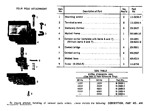 To remove the attachment from the relay merely backout the pullrod and mounting screws. Replace the relay cover plate if operation of relay must be continued. To remove contacts in the contact carrier (item 5) first remove holding screw (item 9) and molded base (item 8). To replace a contact bridge (item 6) depress bridge and spring (item 7) to clear retaining guide bar and slide the old bridge assembly out. Tweezers or similar tool will aid in replacing springs if this becomes necessary. To remove a stationary contact (item 3) first remov e the terminal screw (item 2) completely before pulling contact from chamber. Where position is important parts have been keyed for proper alignment for all except the terminal screw pressure plates which must be oriented with the lip to the outside.