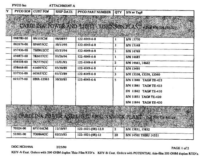 | G. | Generate Sales Orders for replacement of customer identified in-stock and in-service 200 ohm duplex RTD elements manufactured by PYCO as identified in Attachment A. A. | ||