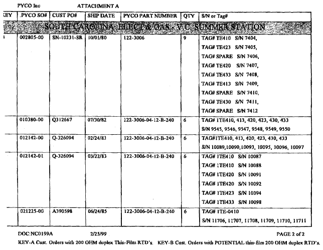 | A. | The deviation identified is limited only to 200 OHM duplex RTD assemblies as identified in Attachment A, KEY-A. Assemblies identified in Attachment A, KEY-B indicate that a potential exists that the 200 OHM duplex RTD sensors used in the fabrication of the assemblies may be thin-film rather than wire-wound. | ||